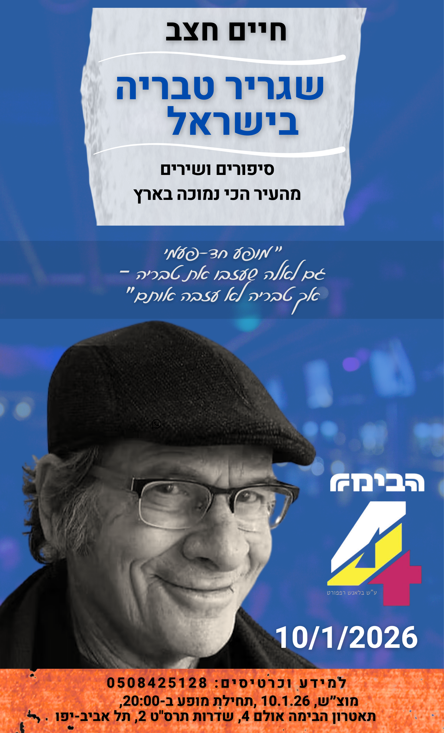 במוצאי שבת, 10.1.26, אני, חיים חצב חוקר ומספר סיפורי טבריה, מעלה את המופע הייחודי ״שגריר טבריה בישראל״ - שירים וסיפורים מטבריה — עבורכם, הטבריינים.